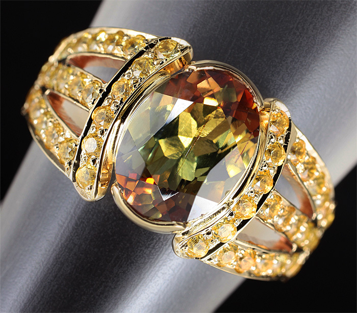 Вашему вниманию предлагается кольцо из золота 585 пробы c андалузитом и желтыми сапфирами! Диаметр сапфиров 2 мм. Площадка 21 х 11 мм, высота 5 мм. Вес изделия 3,9 г. Размер 17,5. Ниже приводятся ювелирные характеристики андалузита.