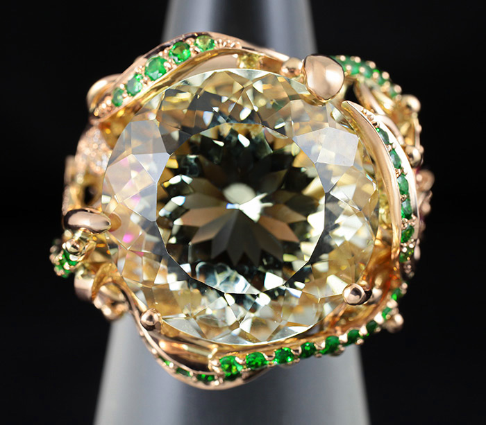 Кольцо с цитрином, цаворитами гранатами, рубинами и бриллиантами