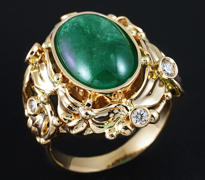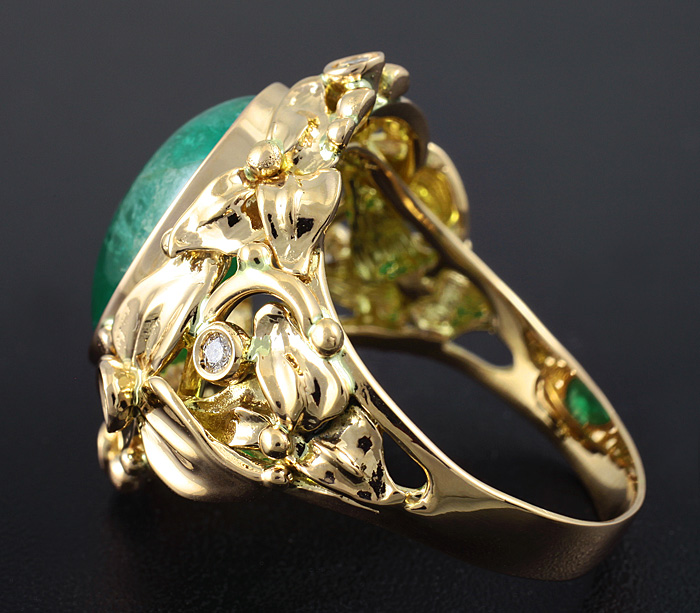 Вашему вниманию предлагается кольцо из золота 585 пробы c изумрудом и 6 бриллиантами! Диаметр бриллиантов от 1,7 мм до 2,3 мм. Площадка 25 х 22 мм, высота 8 мм. Вес изделия 10,6 г. Размер 19,5. Ниже приводятся ювелирные характеристики изумруда.