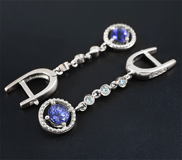 Вашему вниманию предлагаются серьги из золота 585 пробы с танзанитами и бриллиантами (2-3/3-4; А)! Диаметр бриллиантов от 1,3 мм до 2,3 мм. Размеры серег с петлей 47 х 10 мм. Вес пары 7,6 г. Ниже приводятся ювелирные характеристики танзанитов.
