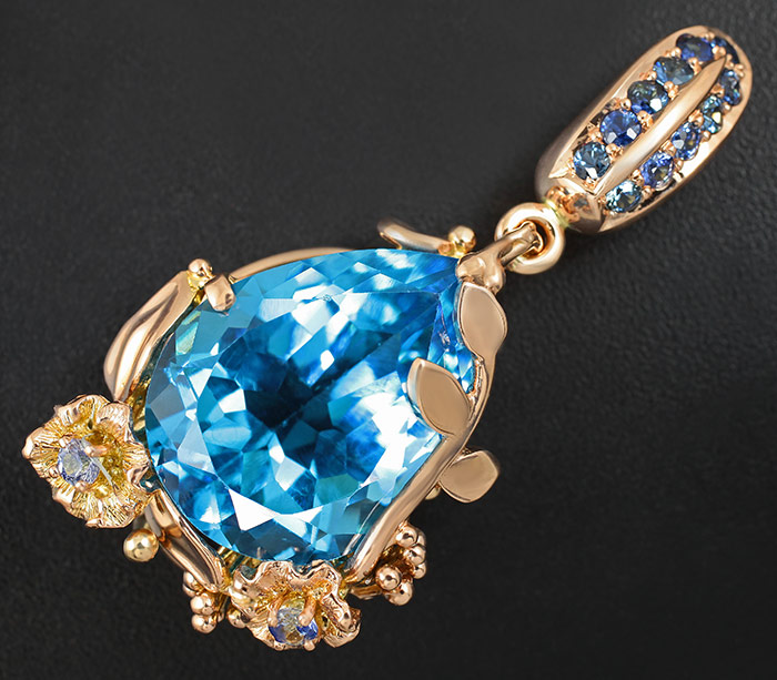 Вашему вниманию предлагается кулон из золота 585 пробы с топазом, 11 синими и 2 голубыми сапфирами! Диаметр сапфиров 2 мм и 2,5 мм. Размеры кулона с петлей 44 х 21 мм. Вес 11,7 г. Ниже приводятся ювелирные характеристики топаза.