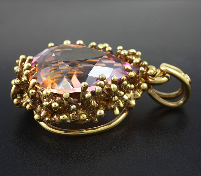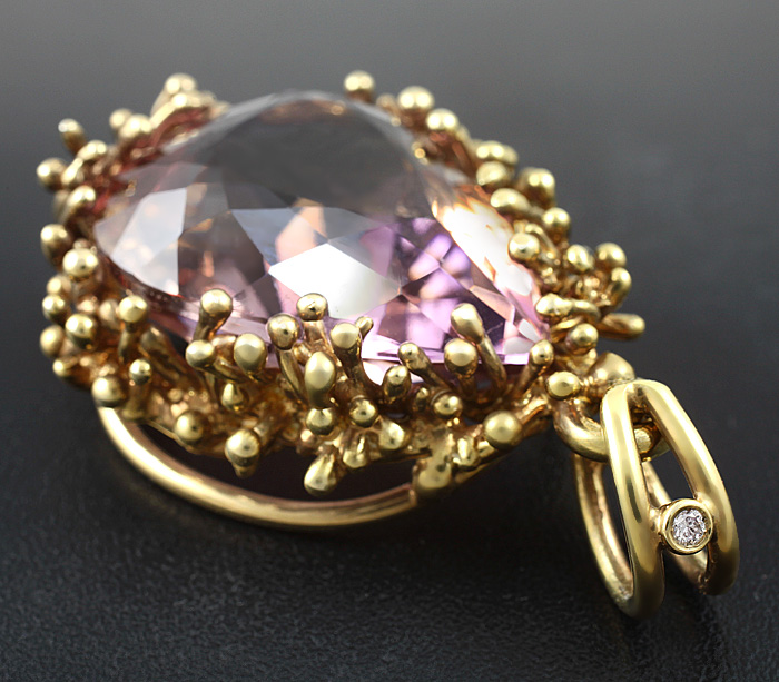 Вашему вниманию предлагается кулон из стерлингового серебра (925 проба) с крупным аметрином и бриллиантом! Изделие позолочено. Диаметр бриллианта 1,5 мм. Размеры кулона с петлей 39 х 24 мм. Вес 13 г. Ниже приводятся ювелирные характеристики аметрина.