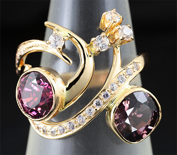 Кольцо с пурпурно-розовыми шпинелями и лейкосапфирами