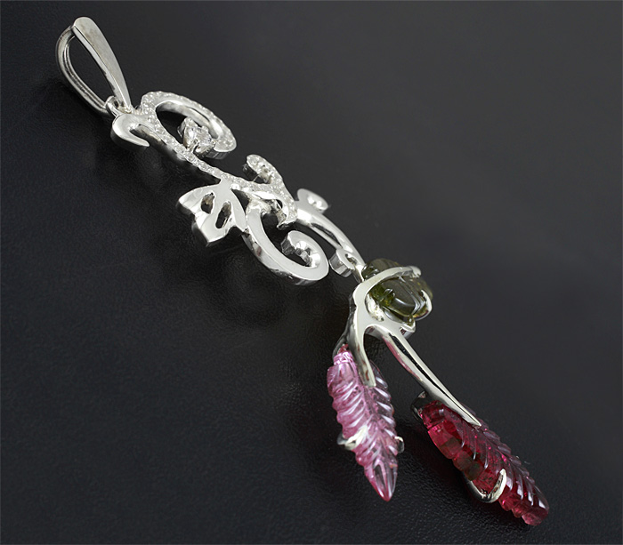 Вашему вниманию предлагается кулон из стерлингового серебра (925 проба) с резными турмалинами и бесцветными цирконами! Турмалины для этого кулона предлагались с готовыми вариантами дизайна украшения, разработанными специально для них. Размеры вставок от 1 мм до 2 мм. Размеры кулона с петлей 61 х 27 мм. Вес 4,5 г. Ниже приводятся ювелирные характеристики вставок.