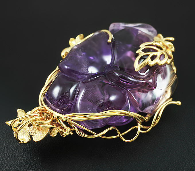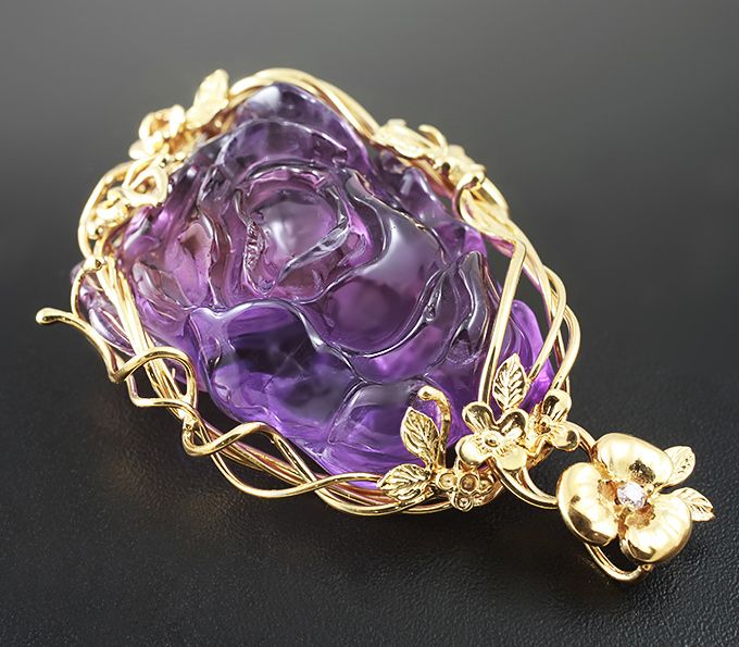 Вашему вниманию предлагается кулон из золота 585 пробы, инкрустированный миниатюрой «Роза» из цельного аметиста и бриллиантом! Диаметр бриллианта 2 мм. Размеры кулона с петлей 60 х 36 мм. Вес 30,4 г. Ниже приводятся ювелирные характеристики аметиста.