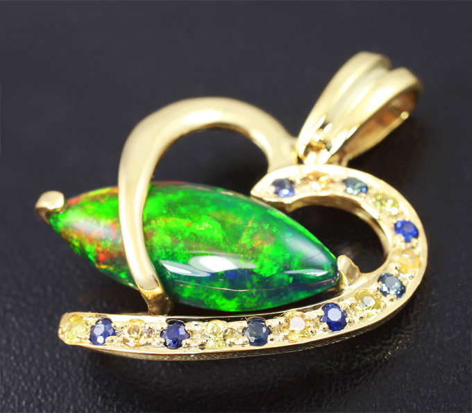 Вашему вниманию предлагается кулон из стерлингового серебра (925 проба) с кристаллическим черным опалом и разноцветными сапфирами! Изделие позолочено. Основные цвета опалесценции: красный, желтый, зеленый и синий. Размеры кулона с петлей 26 х 20 мм. Вес 2,4 г. Ниже приводятся ювелирные характеристики опала.
