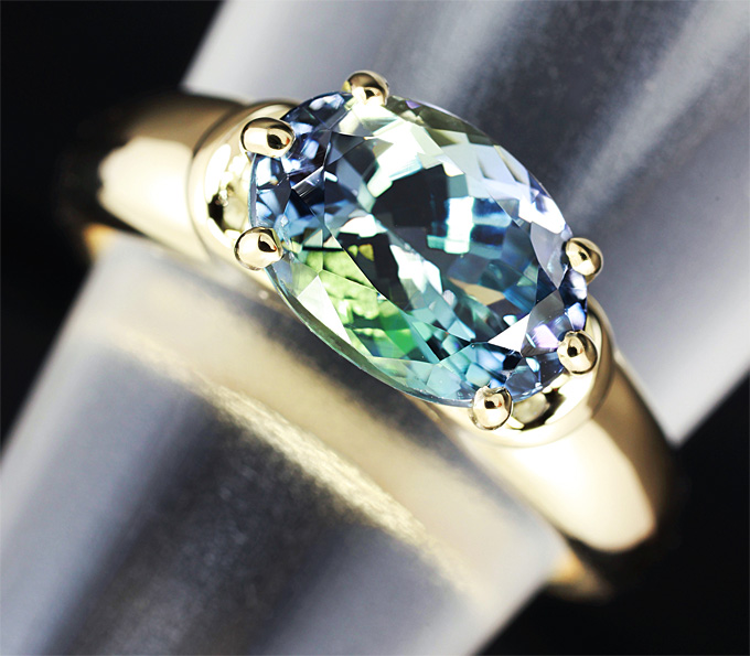 Вашему вниманию предлагается кольцо из золота 585 пробы с полихромным цоизитом! Камень сочетает фиолетовый и зеленый цвета. Площадка 11 х 7 мм, высота 7 мм. Вес изделия 4,3 г. Размер 17,5. Ниже приводятся ювелирные характеристики вставки.
