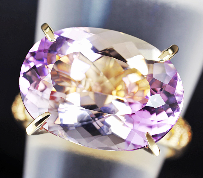 Вашему вниманию предлагается кольцо из золота 585 пробы с аметрином и желтыми сапфирами! Диаметр сапфиров 1,5 мм. Площадка 21 х 12 мм, высота 14 мм. Вес изделия 5,2 г. Размер 18. Ниже приводятся ювелирные характеристики аметрина.