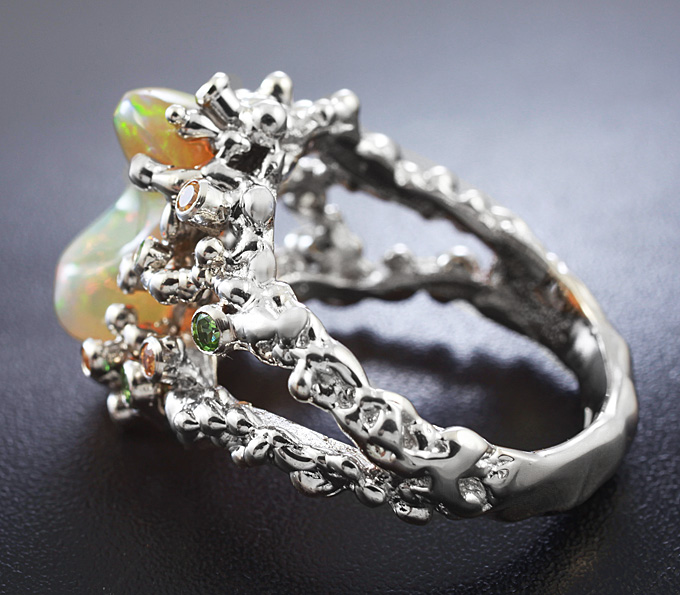 Кольцо c эфиопским опалом, желтыми сапфирами, цаворитами гранатами и бриллиантами