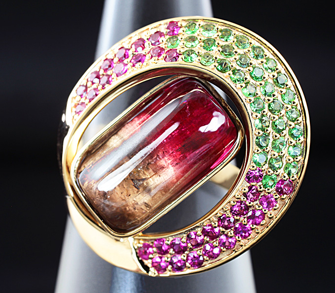 Кольцо с полихромным турмалином, пурпурными сапфирами и цаворитами гранатами