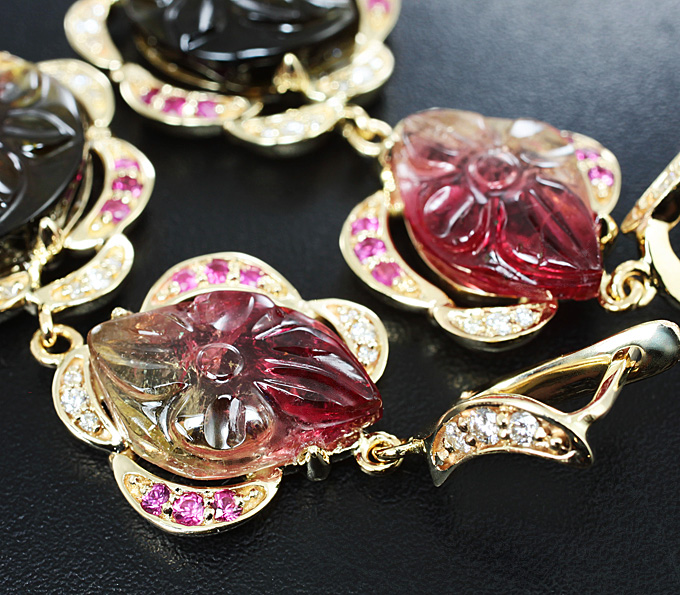 Вашему вниманию предлагаются серьги из золота 585 пробы с резными арбузными турмалинами, пурпурными сапфирами и 42 бриллиантами! Диаметр сапфиров 1,5 мм и 2 мм, бриллиантов от 1 мм до 2 мм. Размеры серег с петлей 58 х 19 мм. Вес пары 19,9 г. Ниже приводятся ювелирные характеристики турмалинов.