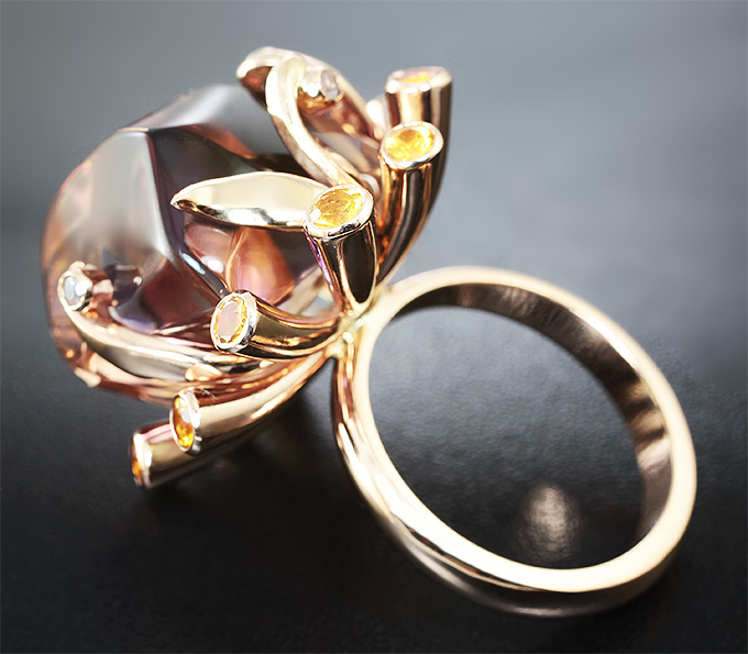Кольцо с крупным кабошоном аметрина, желытми и бесцветными сапфирами