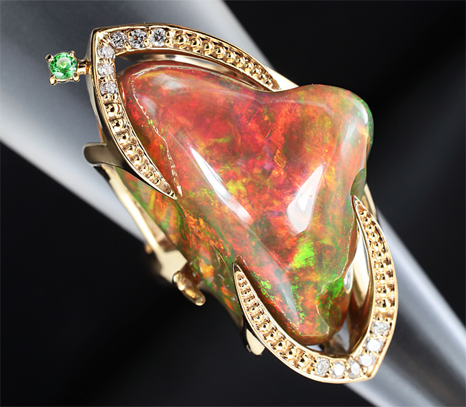 Кольцо с фантастическим опалом, бриллиантами и цаворитом гранатом
