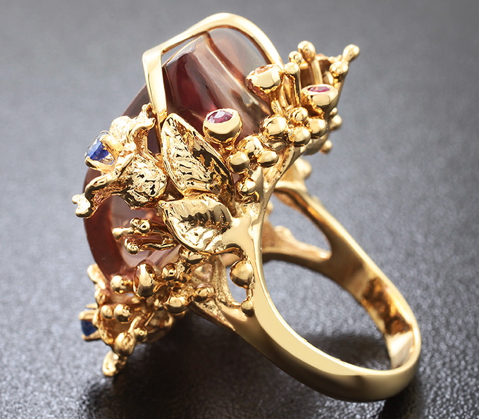 Вашему вниманию предлагается кольцо из золота 585 пробы c кабошоном аметрина и разноцветными сапфирами! Диаметр вставок 2 мм и 2,5 мм. Площадка 31 х 31 мм, высота 14 мм. Вес изделия 22,1 г. Размер 17. Ниже приводятся ювелирные характеристики вставки.