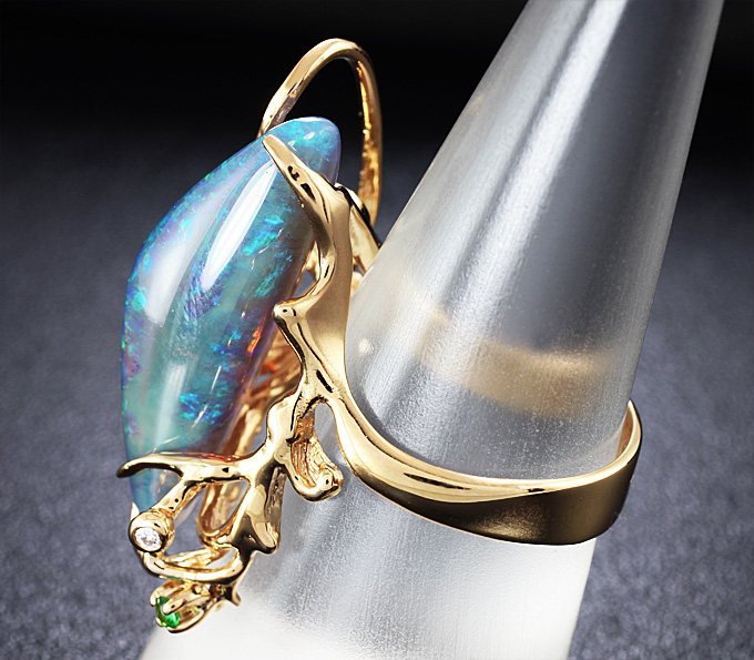 Кольцо c австралийским кристаллическим опалом, цаворитом гранатом и бриллиантами
