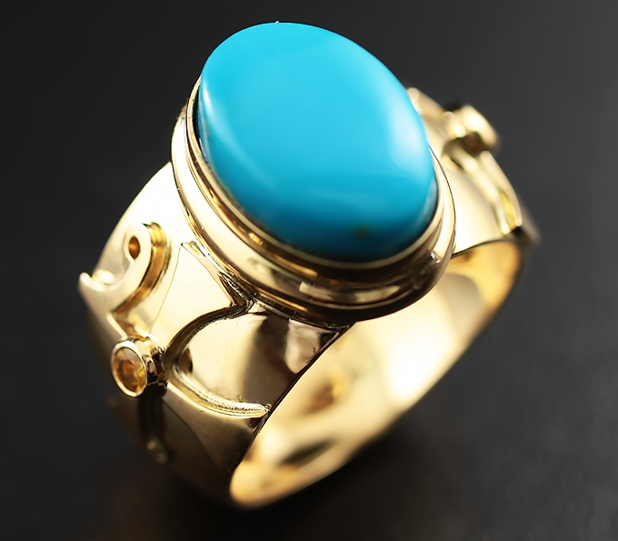 Вашему вниманию предлагается кольцо из золота 750 пробы с иранской бирюзой и желтыми сапфирами! Диаметр сапфиров 3 мм. Ширина площадки 17 мм, высота 10 мм. Вес изделия 19 г. Размер 21. Ниже приводятся ювелирные характеристики бирюзы.
