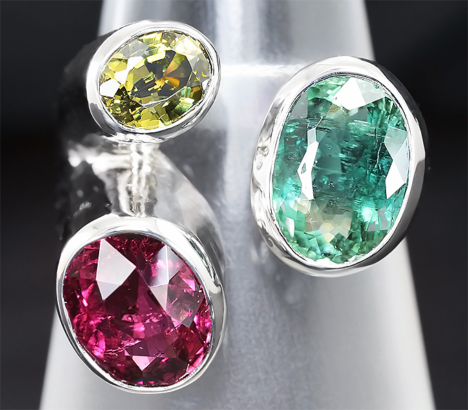 Кольцо с полихромным индиголит турмалином, демантоидом и рубеллитом