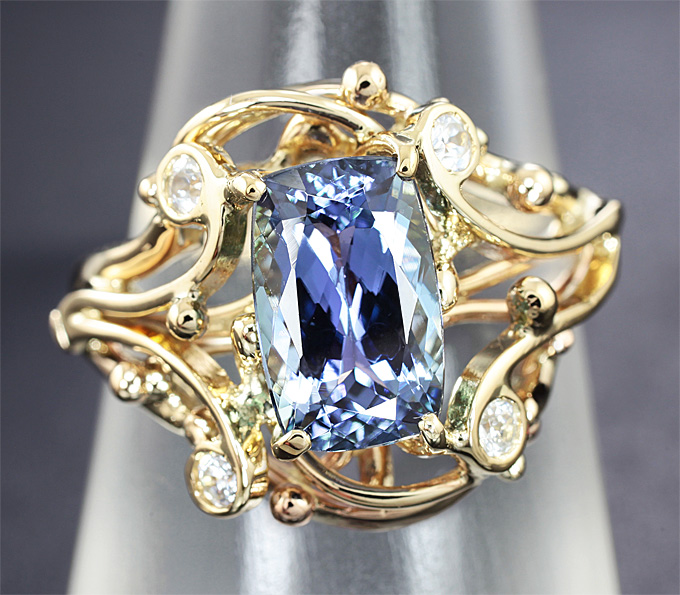 Вашему вниманию предлагается кольцо из золота 585 пробы с танзанитом и бесцветными сапфирами! Диаметр дополнительной инкрустации 2 мм. Площадка 17 х 12 мм, высота 6 мм. Вес изделия 5,9 г. Размер 18. Ниже приводятся ювелирные характеристики танзанитами.