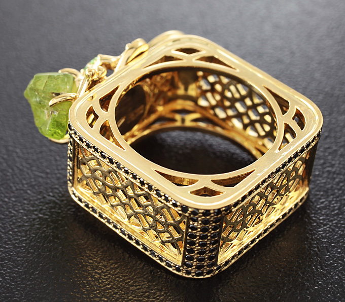 Вашему вниманию предлагается кольцо из желтого золота 750 пробы с перидотом, цаворитами гранатами, 224 черными и 40 бесцветными бриллиантами! Диаметр дополнительной инкрустации от 1 мм до 2 мм. Площадка 25 х 16 мм, высота 12 мм. Вес изделия 21,6 г. Размер 18,75. Ниже приводятся ювелирные характеристики перидота.