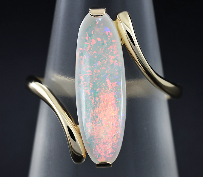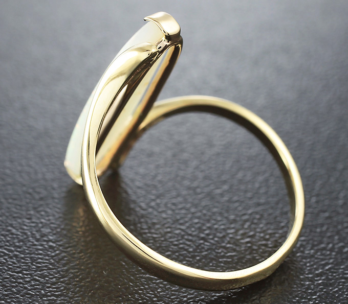 Вашему вниманию предлагается кольцо из желтого золота 585 пробы с австралийским solid опалом! Основные цвета опалесценции: красный, желтый и зеленый. Ширина площадки 19 мм, высота 3 мм. Вес изделия 2,4 г. Размер 18. Ниже приводятся ювелирные характеристики вставки.