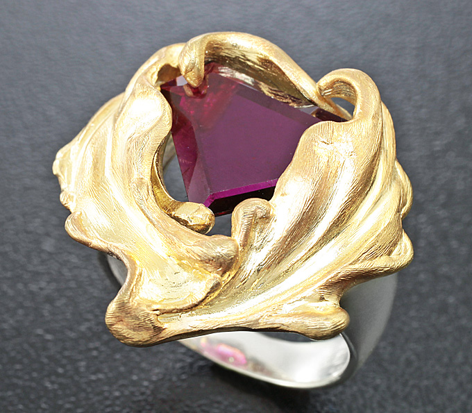 Вашему вниманию предлагается кольцо из стерлингового серебра (925 проба) cо слайсом рубеллита турмалина! Изделие частично позолочено. Площадка 24 х 23 мм, высота 5 мм. Вес изделия 9,3 г. Размер 17. Ниже приводятся ювелирные характеристики вставки.