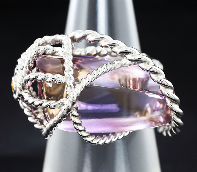 Вашему вниманию предлагается кольцо из стерлингового серебра (925 проба) c аметрином и цитрином! Диаметр дополнительной инкрустации 2 мм. Площадка 27 х 18 мм, высота 16 мм. Вес изделия 13,9 г. Размер 18,25. Ниже приводятся ювелирные характеристики вставки.