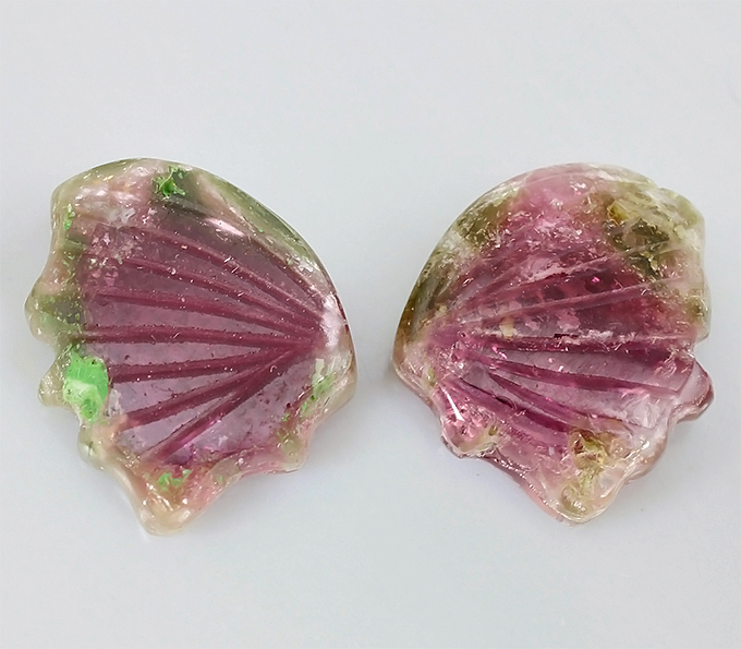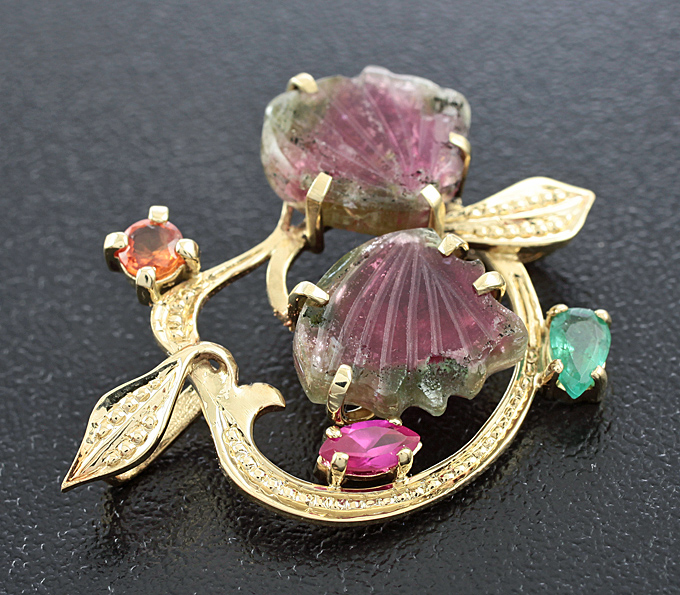 Кулон с резными арбузными и разноцветными ограненными турмалинами