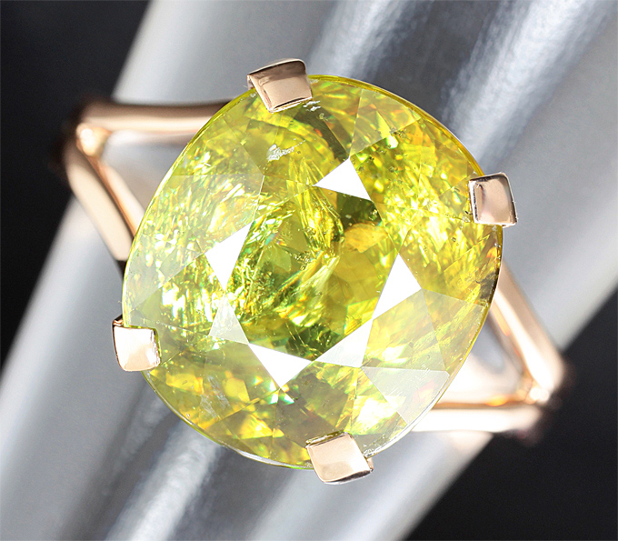 Вашему вниманию предлагается кольцо из розового золота 585 пробы c крупным желто-зеленым сфеном! Площадка 12,2 х 11 мм, высота 8 мм. Вес изделия 4 г. Размер 18. Ниже приводятся ювелирные характеристики вставки.