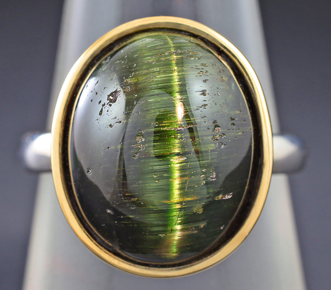 Кольцо, инкрустированное крупным турмалином с эффектом кошачьего глаза