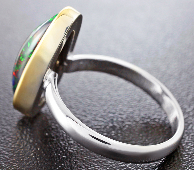 Вашему вниманию предлагается кольцо из стерлингового серебра (925 проба) c кристаллическим черным опалом! Изделие частично позолочено. Основные цвета опалесценции: красный и зеленый. Площадка 19 х 9 мм, высота 6 мм. Вес изделия 3,7 г. Размер 18. Ниже приводятся ювелирные характеристики вставки.