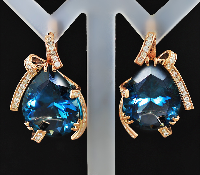 Вашему вниманию предлагаются серьги из красного золота 585 пробы с насыщенно-синими топазами массой 40,5 карат и муассанитами! Размеры вставок 1,5 мм и 22 16 мм. Площадка серег 32 х 21 мм. Вес пары 16,2 г.