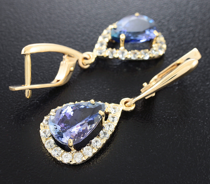 Вашему вниманию предлагаются серьги из желтого золота 585 пробы с чистейшими танзанитами и бесцветными цирконами! Диаметр цирконов 2 мм. Размеры серег с петлей 35 х 13 мм. Вес пары 5,4 г. Ниже приводятся ювелирные характеристики танзанитов.