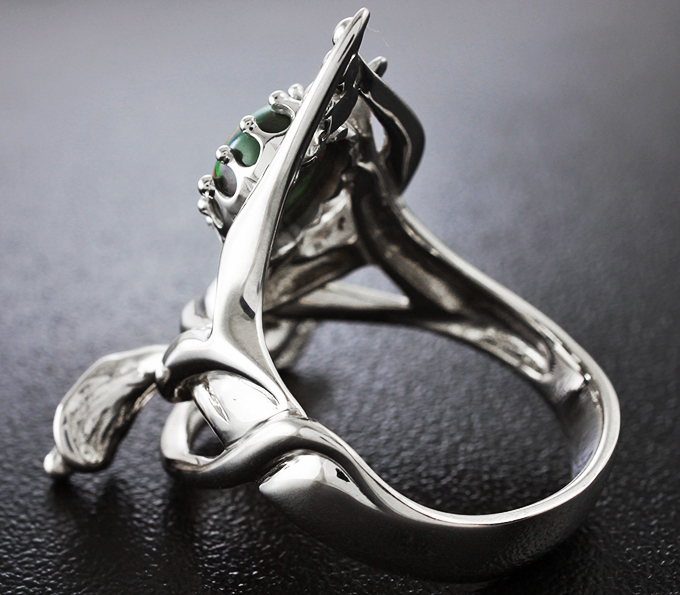 Вашему вниманию предлагается кольцо из стерлингового серебра (925 проба) c кристаллическим черным опалом массой 1,51 карат! Основные цвета опалесценции: красный, желтый и зеленый. Размеры вставок 8 х 6 мм. Площадка 32 х 23 мм, высота 5 мм. Вес изделия 10,3 г. Размер 19,5. Ниже приводятся ювелирные характеристики вставки.