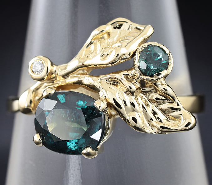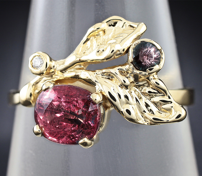 Кольцо, инкрустированное гранатами с александритовым эффектом и бриллиантом