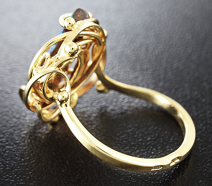 Вашему вниманию предлагается кольцо из желтого золота 585 пробы с австралийским болдер опалом! Роскошная, яркая сине-зеленая опалесценция. Площадка 17 х 16 мм, высота 7 мм. Вес изделия 4,1 г. Размер 17,5. Ниже приводятся ювелирные характеристики вставки.