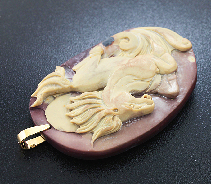 Вашему вниманию предлагается замечательный образец камнерезного искусства – камея-подвеска «Мустанг» из желтого золота 585 пробы и цельной яшмы! Ручная работа! Не подвергалась окрашиванию. Размеры с петлей 67 х 42 х 11 мм. Вес 38,4 г.