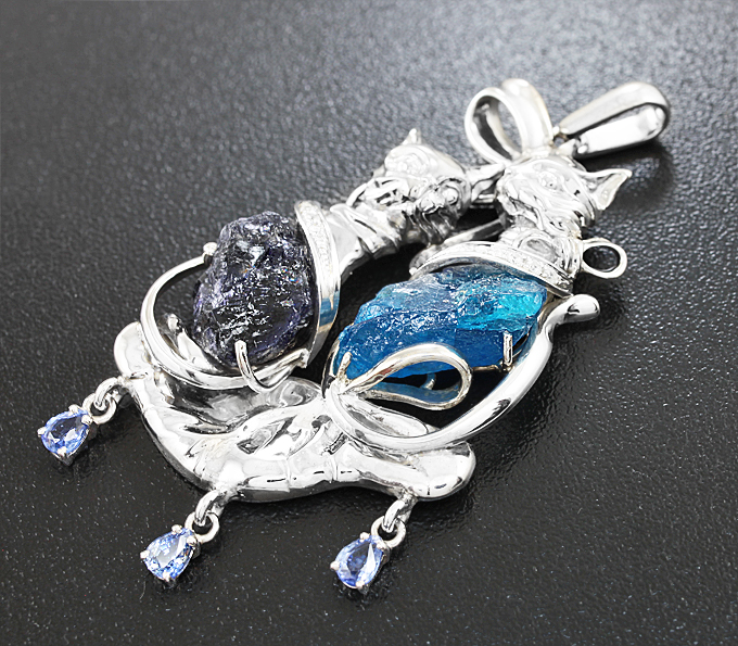 Кулон с необработанными апатитом и иолитом, а также синими и бесцветными сапфирами