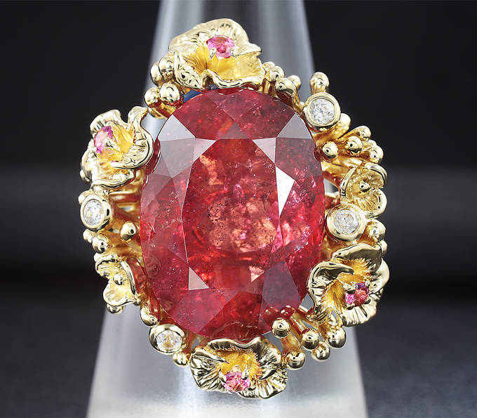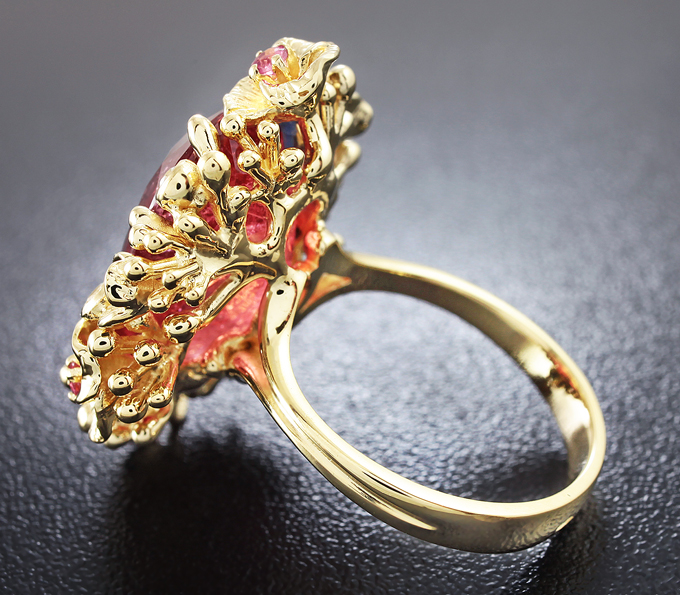 Вашему вниманию предлагается кольцо из желтого золота 585 пробы с красным турмалином, розовым турмалином и лейкосапфирами! Диаметр дополнительной инкрустации 2 мм. Площадка 29 х 23 мм, высота 10 мм. Вес изделия 13,9 г. Размер 19. Ниже приводятся ювелирные характеристики вставки.