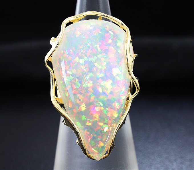 Вашему вниманию предлагается кольцо из желтого золота 585 пробы с потрясающим крупным кристаллическим опалом! Основные цвета опалесценции: красный, желтый и зеленый. Площадка 35 х 22 мм, высота 7 мм. Вес изделия 11 г. Размер 16,25. Ниже приводятся ювелирные характеристики вставки.