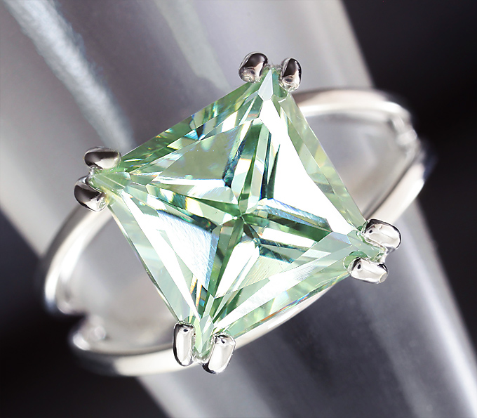 Вашему вниманию предлагается кольцо из белого золота 585 пробы c зеленым муассанитом! Площадка 11 х 11 мм, высота 7 мм. Вес изделия 3,1 г. Размер 16,5. Ниже приводятся ювелирные характеристики вставки.