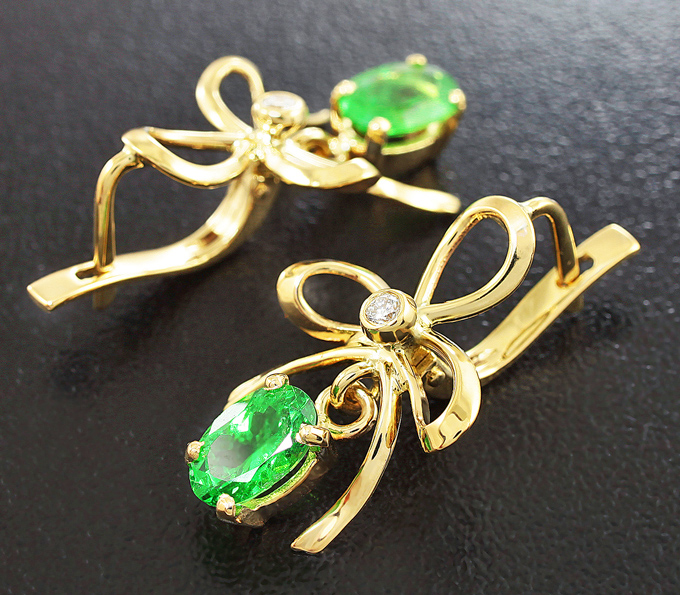 Вашему вниманию предлагаются серьги из желтого золота 585 пробы с цаворитами гранатами и 2 бриллиантами! Диаметр дополнительной инкрустации 2 мм. Площадка серег 23 х 14 мм. Вес пары 3,8 г. Ниже приводятся ювелирные характеристики цаворитов.