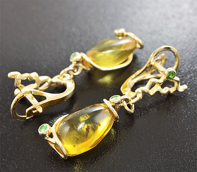 Вашему вниманию предлагаются серьги из желтого золота 585 пробы с доминиканским янтарем и цаворитами гранатами! Диаметр дополнительной инкрустации 2 мм. Размеры серег с петлей 38 х 10 мм. Вес пары 6,4 г. Ниже приводятся ювелирные характеристики янтаря.