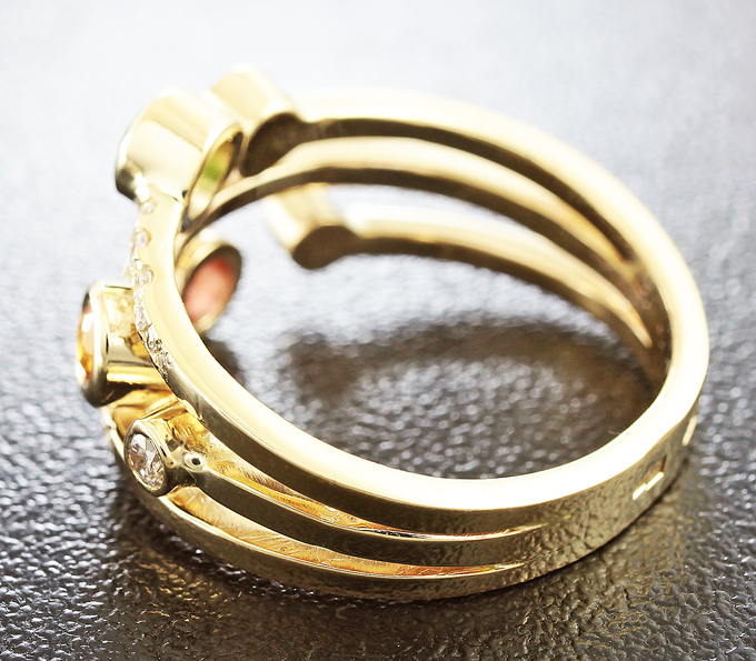 Вашему вниманию предлагается кольцо из желтого золота 585 пробы с разноцветными сапфирами и 22 бриллиантами! Диаметр вставок от 0,7 мм до 3 мм. Площадка 19 х 11 мм, высота 3 мм. Вес изделия 4,6 г. Размер 16,5.