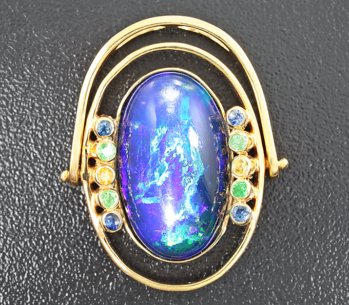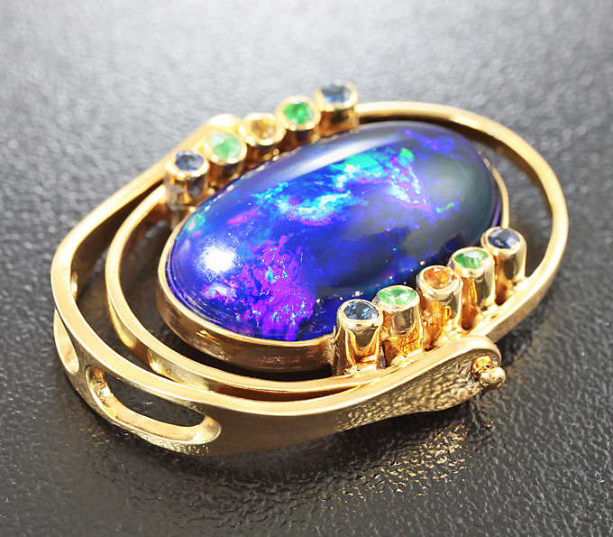 Кольцо-трансформер с кристаллическим черным опалом, сапфирами и цаворитами гранатами