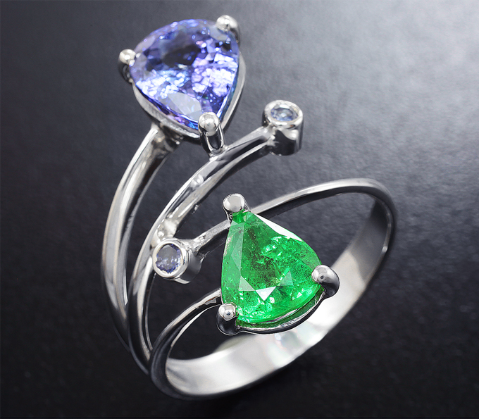 Вашему вниманию предлагается кольцо из стерлингового серебра (925 проба) c цаворитом гранатом и танзанитами! Диаметр дополнительной инкрустации 2,5 мм. Площадка 25 х 15 мм, высота 7 мм. Вес изделия 4,9 г. Размер 20. Ниже приводятся ювелирные характеристики цаворита и крупного танзанита.