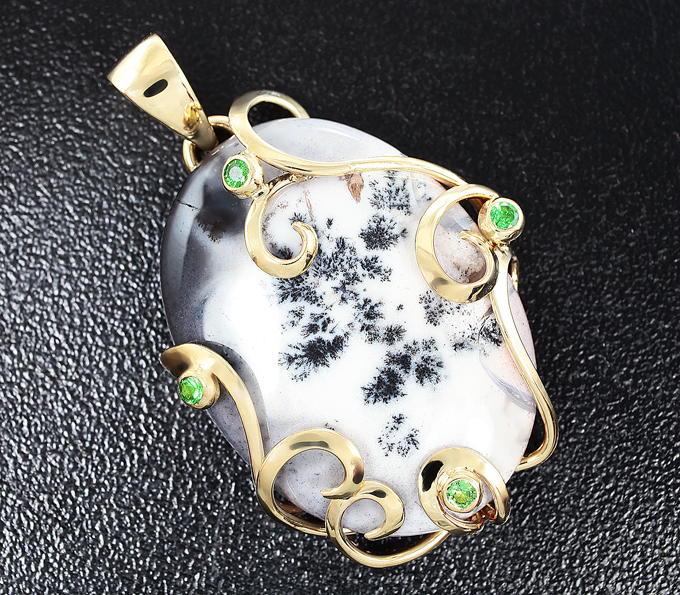 Вашему вниманию предлагается кулон из желтого золота 585 пробы с дендритическим агатом массой 22 карат и цаворитами гранатами! Диаметр дополнительной инкрустации 2 мм. Размеры кулона с петлей 39 х 24 мм. Вес изделия 7,7 г. Ниже приводятся ювелирные характеристики агата.