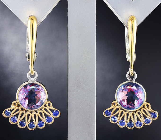 Вашему вниманию предлагаются серьги из стерлингового серебра (925 проба) с флюоритами и синими сапфирами! Изделие частично позолочено. При смене освещения камни меняют цвет с синего на фиолетовый. Диаметр дополнительной инкрустации 2 мм. Размеры серег с петлей 32 х 23 мм. Вес пары 4,4 г. Ниже приводятся ювелирные характеристики флюоритов.