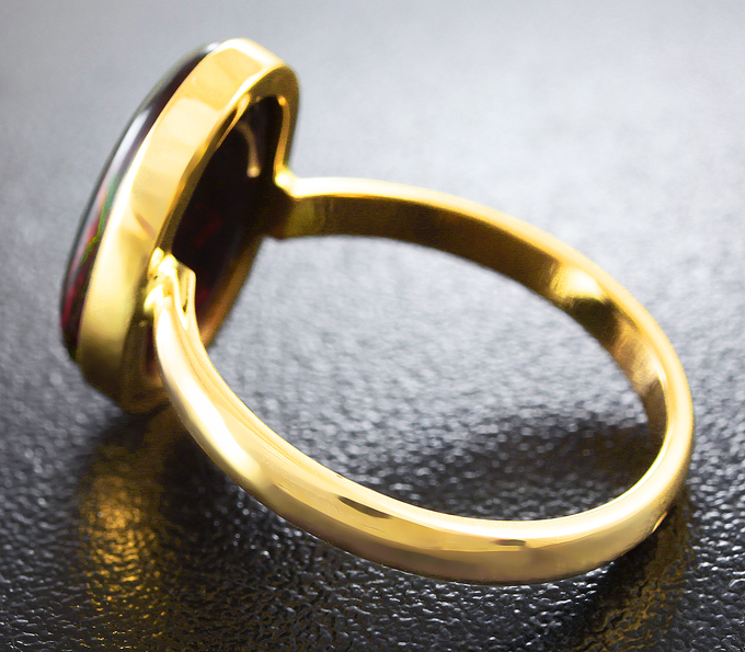 Вашему вниманию предлагается кольцо из желтого золота 585 пробы с кристаллическим черным опалом! Основные цвета опалесценции: красный, желтый и зеленый. Размеры вставки 15 х 9 мм. Площадка 16 х 10 мм, высота 5 мм. Вес изделия 3,26 г. Размер 18. Ниже приводятся ювелирные характеристики вставки.