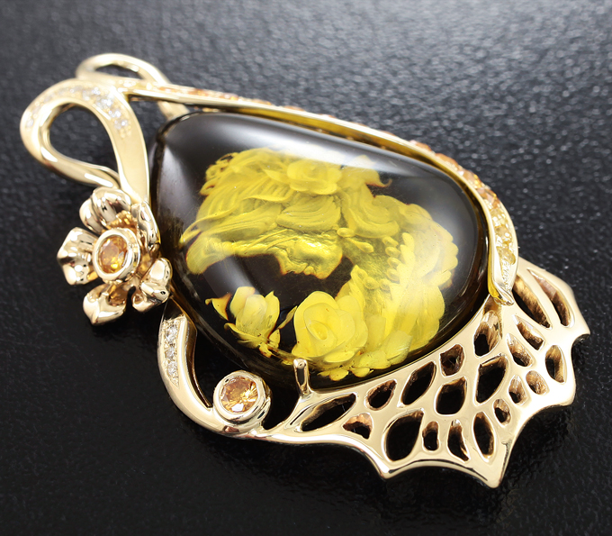 Кулон с резным янтарем 11,1 карат, сапфирами и бриллиантами