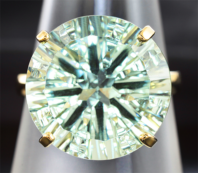 Вашему вниманию предлагается кольцо из желтого золота 585 пробы с зеленым аметистом авторской огранки! Диаметр площадки 16 мм, высота 11 мм. Вес изделия 6,1 г. Размер 18,5. Ниже приводятся ювелирные характеристик вставки.